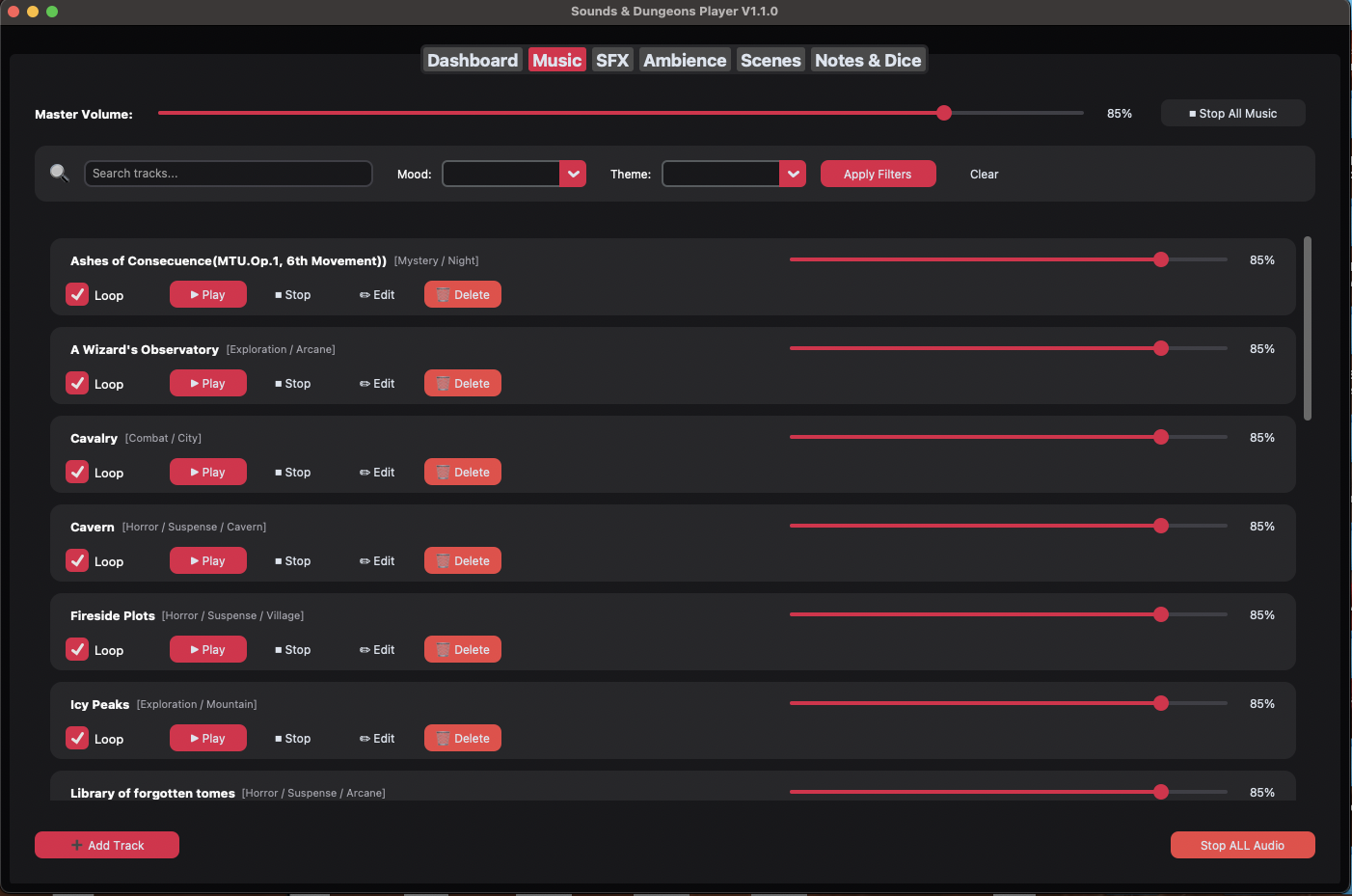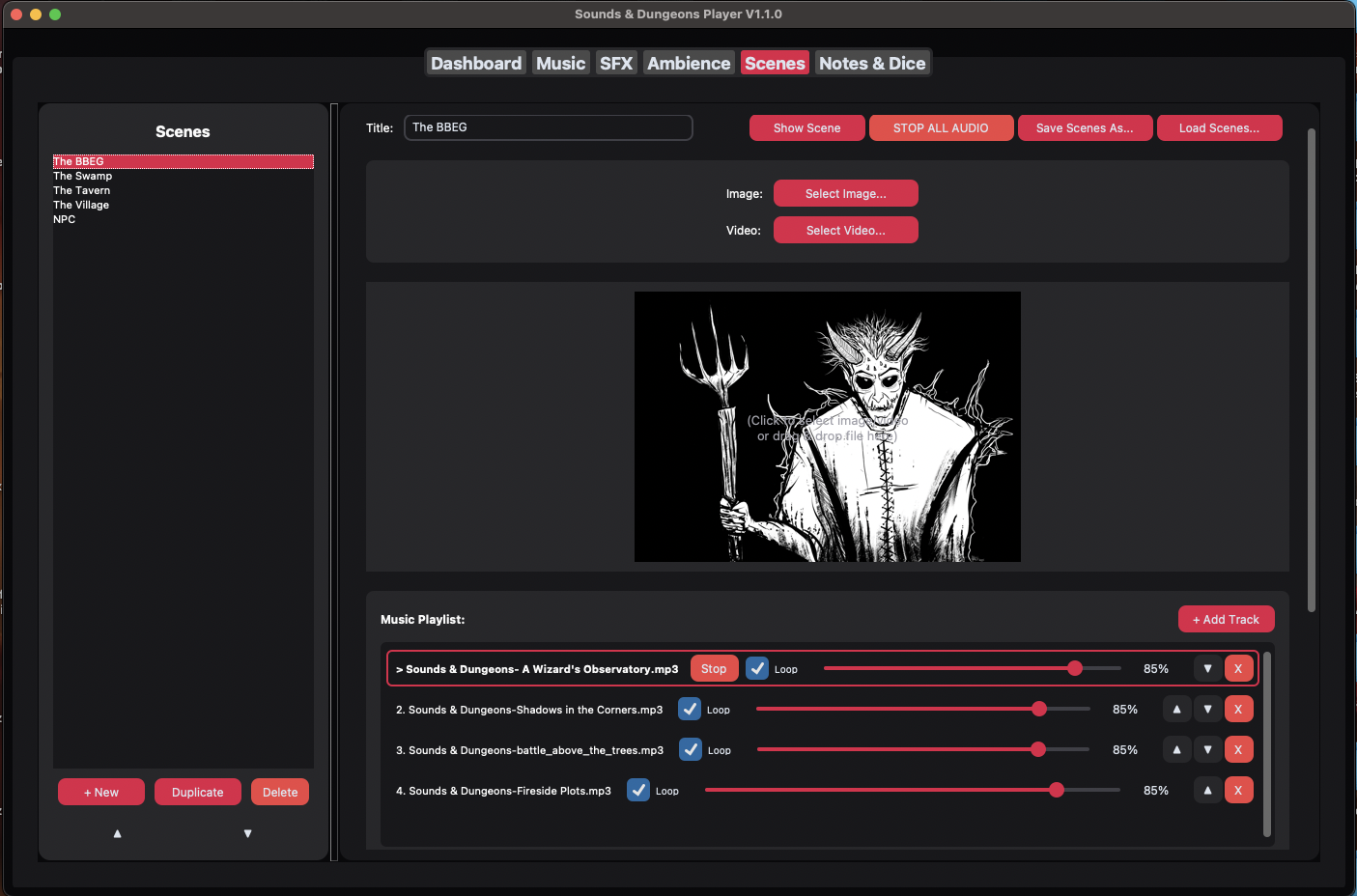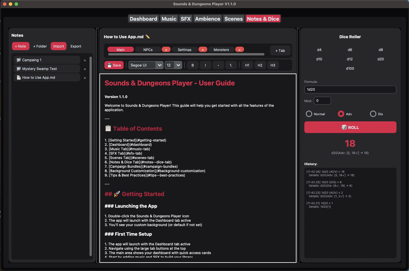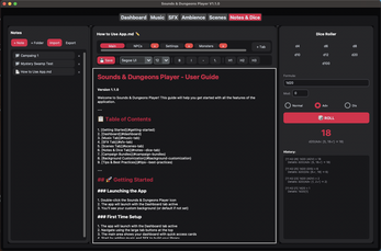 This app brings music, sound effects, ambience, visuals, notes, and dice into a single, easy-to-use tool — so you can focus on the table, not your laptop.